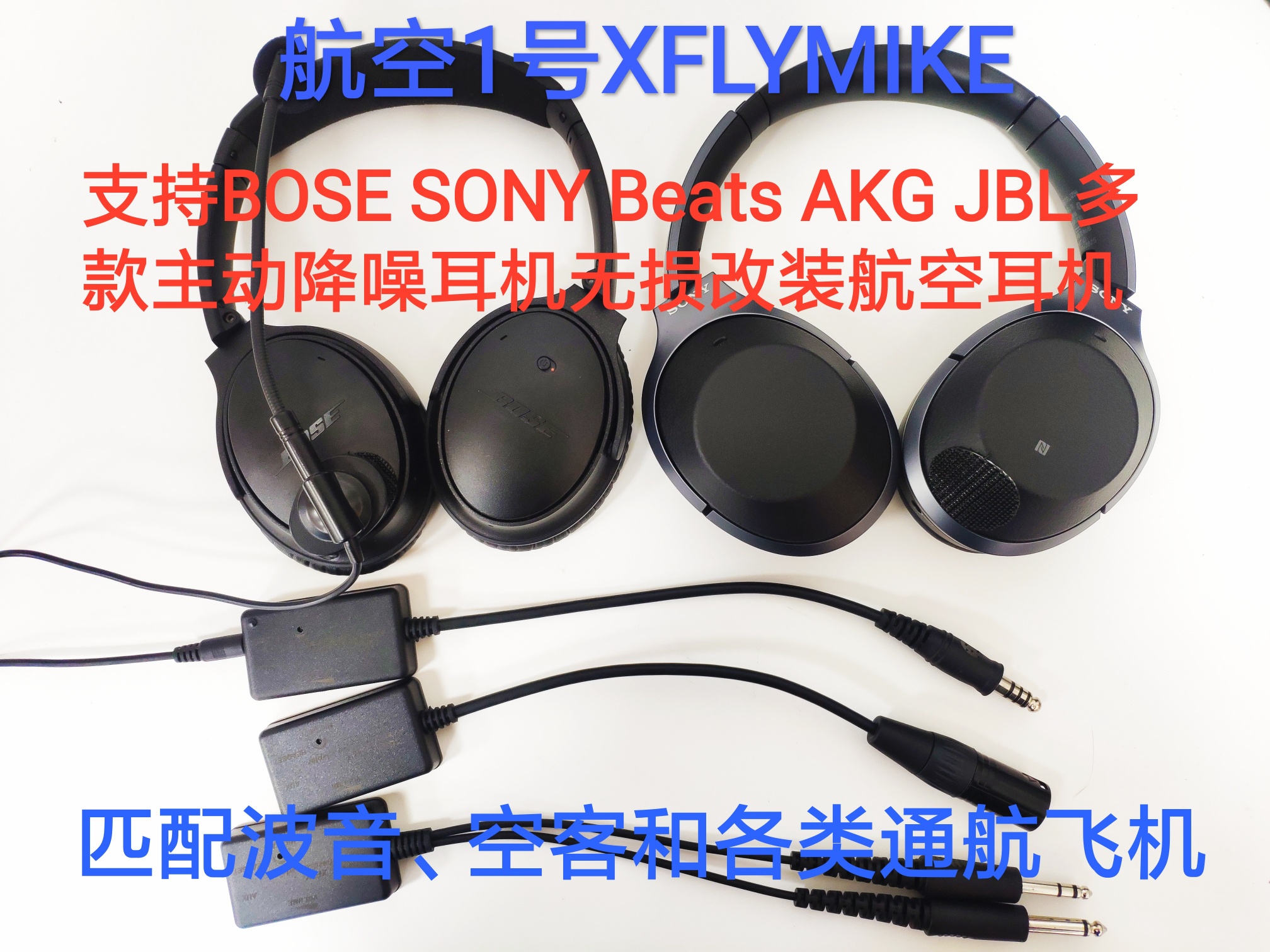 可配合BOSE QC25、QC35、QC35II、BOSE 700、SONY WH-1000XM2/M3等民用主动降噪耳机,无损改装为类似BOSE A20的航空降噪通讯耳机。 可全面应用与波音空客及各类通航飞机,以及各类通航固定翼、旋翼机。功能上可以全面代替uflymike和BOSE A20。主管降噪感受可以达到A20的80%